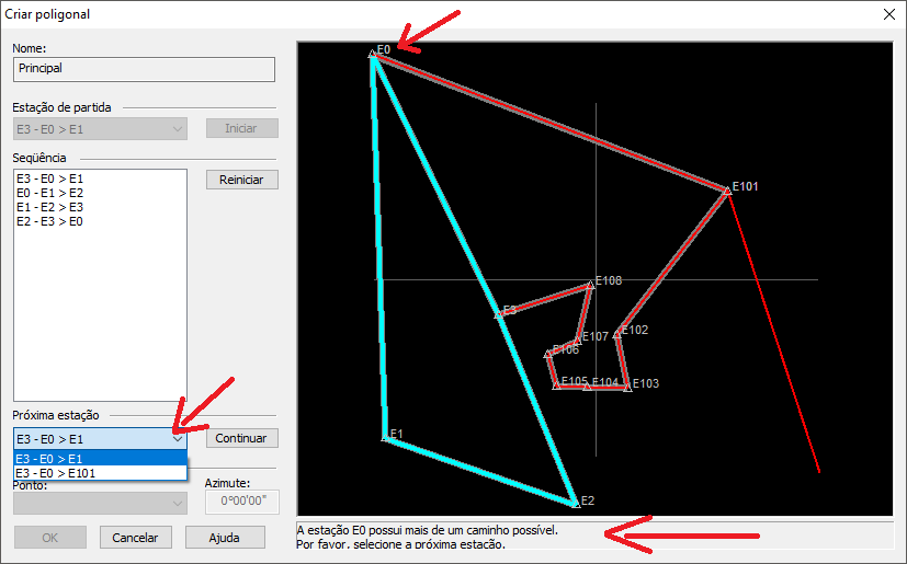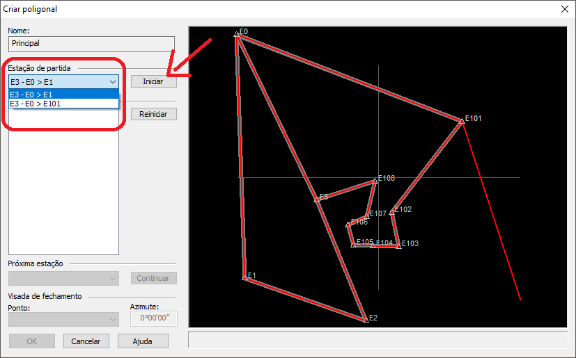 Na janela abaixo que será aberta em seguida, observe que em "Estação de Partida", que temos 2 possíveis caminhos, devido ao fato de termos uma segunda Poligonal que participa no mesmo ponto de partida da principal.
