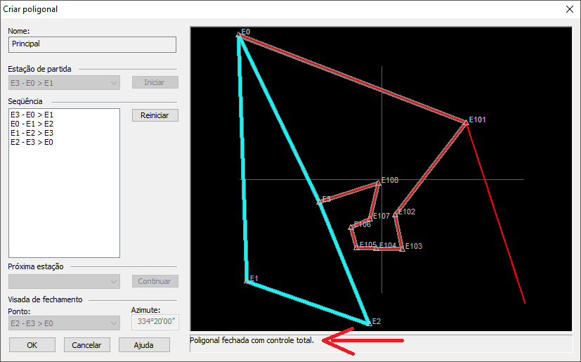 Agora a poligonal, informa o resultado: Poligonal Fechada com Controle Total e no Croqui a mesma representa em Azul. Clicamos em OK.