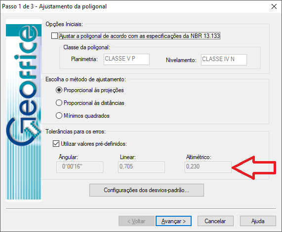 No passo 1 de 3, temos a opção de usar as referencias da NBR 13.133 e suas classes. Também já vem acionado o método "Proporcional às Projeções" que é o comumente utilizado.