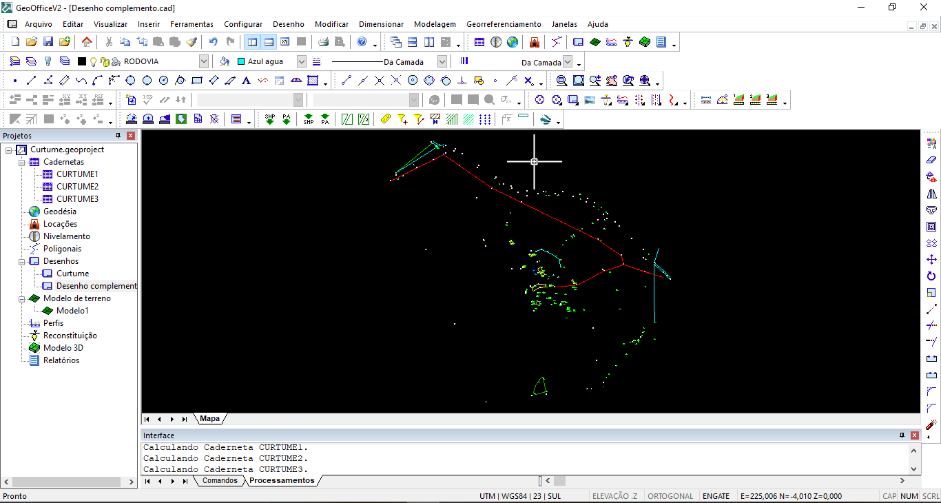 Em seguida o software GeoOffice vai te pedir o ponto de inserção e então novamente você digita as mesmas coordenadas 0,0 (zero vírgula zero) e dê "ENTER" para confirmar. Imediatamente todos os elementos copiados do Desenho de Origem são colados no Desenho de Destino, usando a mesma coordenada que você tinha antes, com isso pode considerar que os Desenhos estão encaixados.