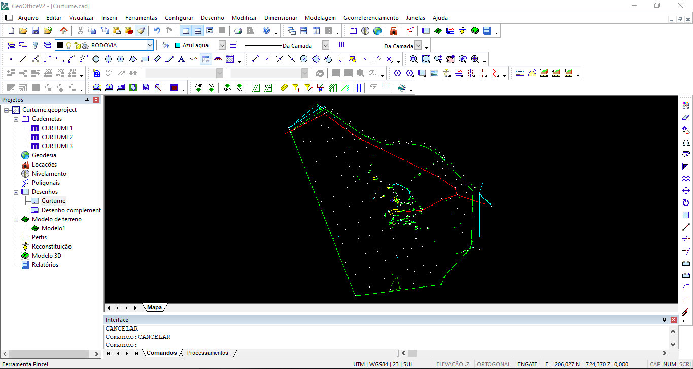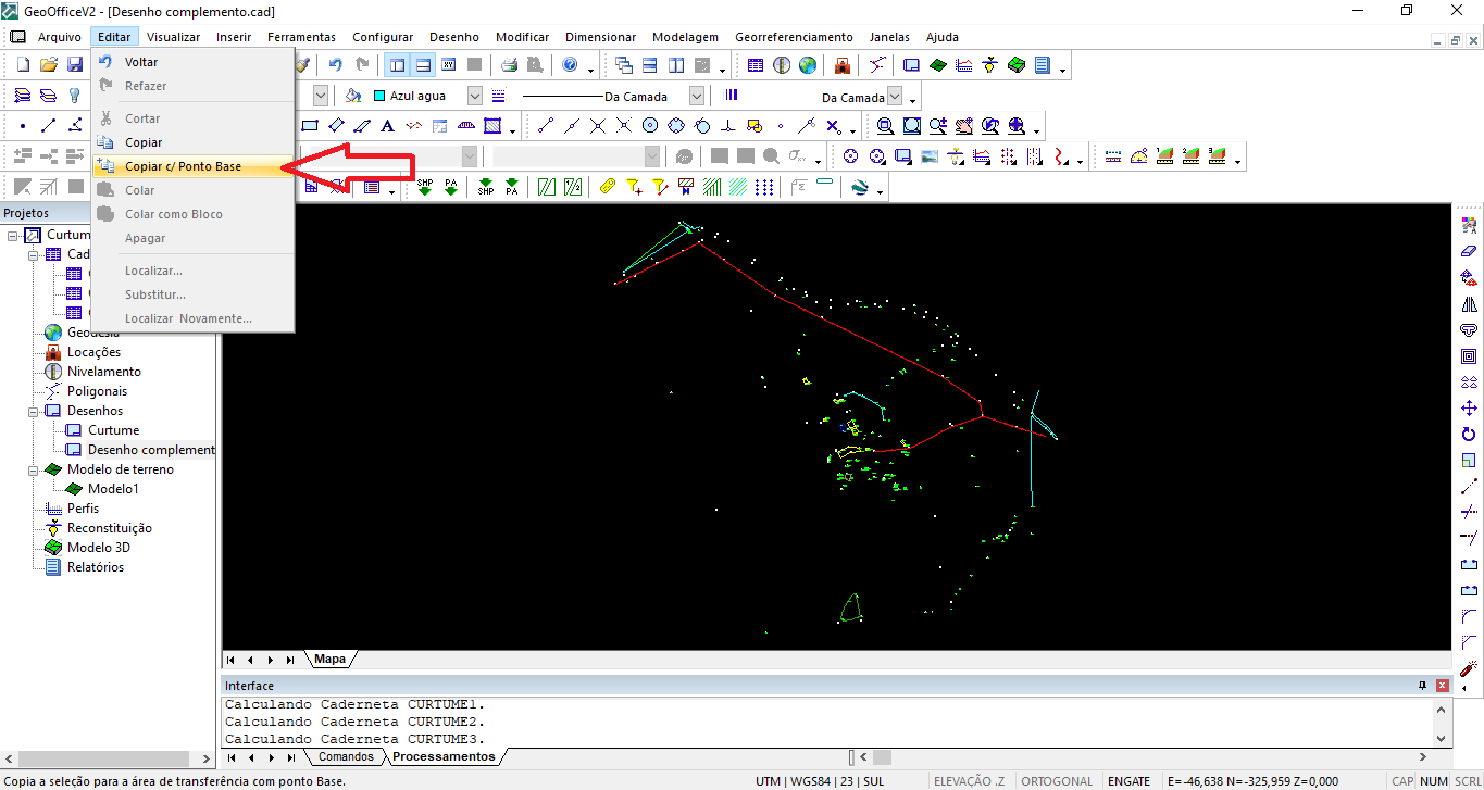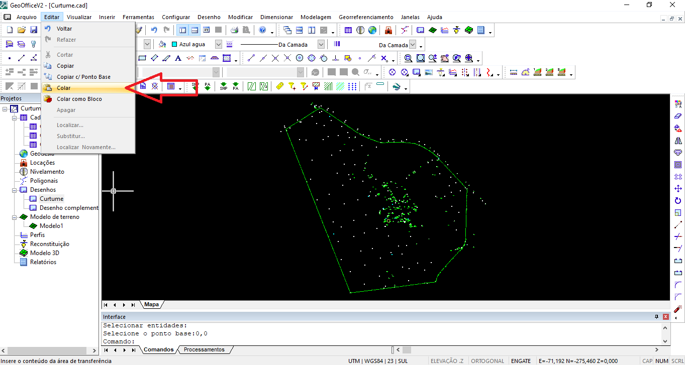 Em seguida, aperte "ENTER" e observe que na Linha de Comandos do GeoOffice, o software vai te perguntar qual é o Ponto Base. Digite 0,0 (zero vírgula zero) e dê "Enter" novamente para confirmar essa origem.