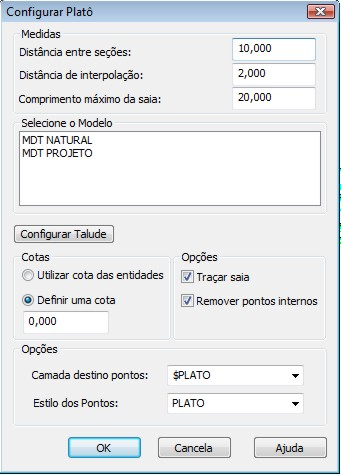 Acionando a ferramenta selecione o perímetro onde será criado o Platô desejado, em seguida clique com o botão direito do Mouse ou tecle ENTER. Uma caixa de diálogo se abrirá, onde terá as configurações e as características que se quer para o Platô.