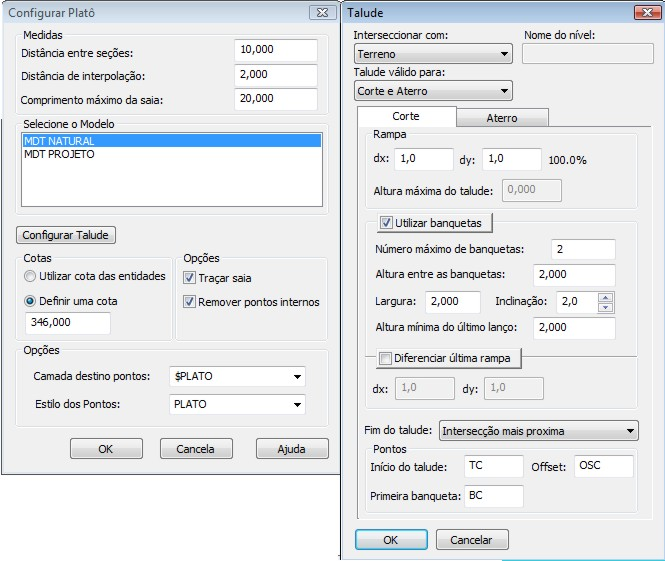 Configurar Talude: configurar os parâmetros de definição da saia do platô. E ela pode ou não ter banquetas. Configure de acordo com as características que quer deixar o platô.Depois de configurar o talude e ter definido o platô, clique em Ok. O Platô será desenhado de acordo com as configurações.
