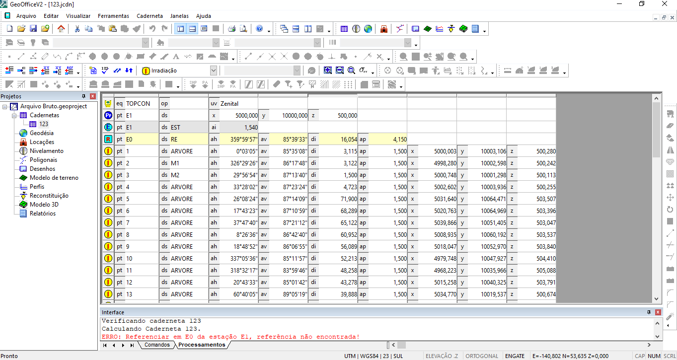 A caderneta será criada pelo GeoOffice e apresentará os Dados Brutos, importados do arquivo de levantamento.