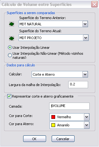 Em “Dados para Cálculo”, selecione a opção desejada para Corte/Aterro e configure a “Malha de Interpolação”. Quanto menor for este valor, mais preciso será o cálculo, pois o mesmo determina a largura da malha triangular que neste caso é calculado pelo método prismático.