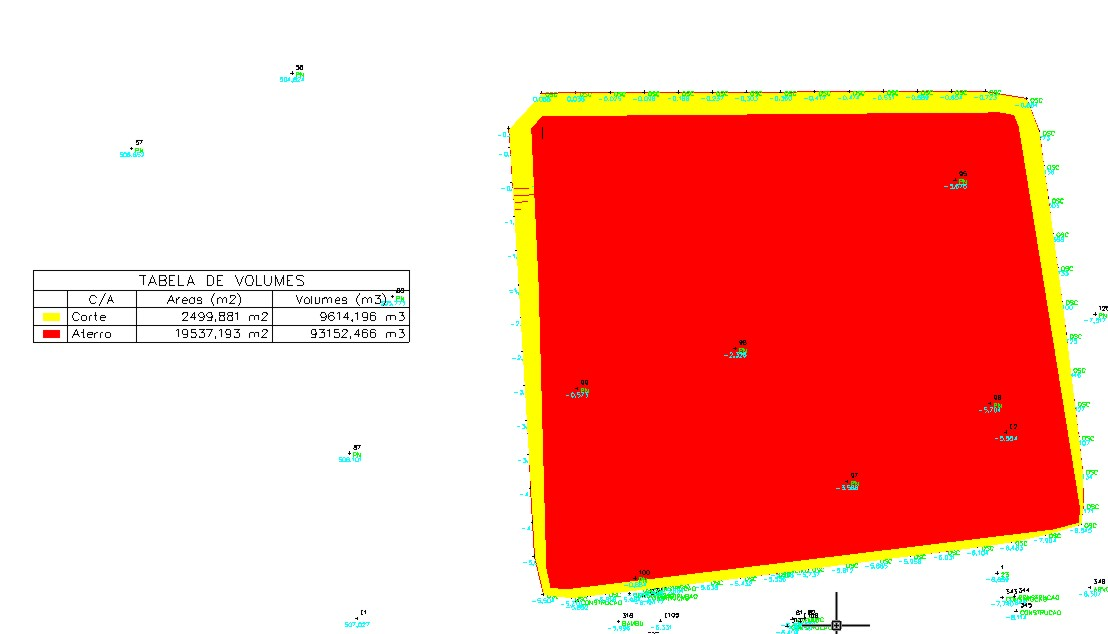 Veja abaixo um exemplo de sua área representada graficamente com os volumes de Corte e Aterro junto a Tabela.