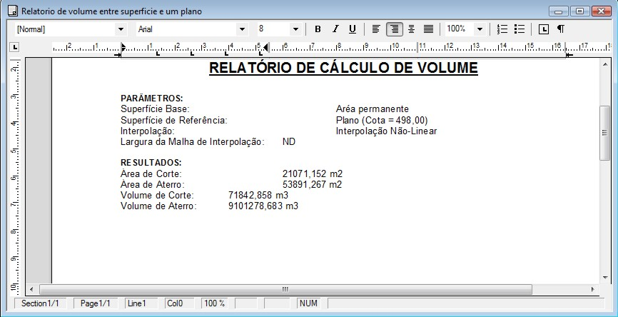 Em seguida será apresentada essa janela informando os parâmetros do cálculo, seus volumes de Corte e Aterro em m3 e suas respectivas áreas em m2.