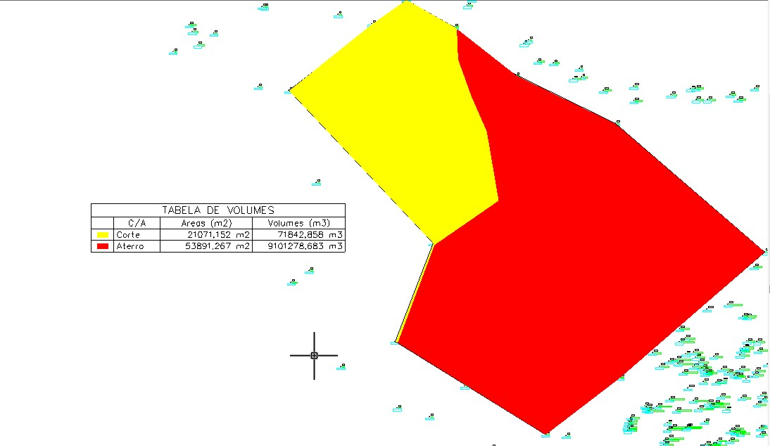 Veja abaixo um exemplo de sua área representada graficamente com os volumes de Corte e Aterro junto a Tabela.